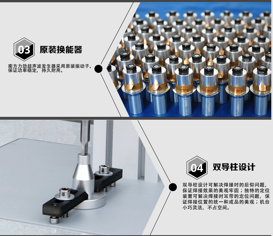 這款超聲波點焊機采用了NTK換能器,確保輸出穩定,性能可靠。同時,整機設計小巧,操作方便,無需復雜的設置和調試,即可投入使用。不論是拉鏈定位、上下止、肩帶焊接,還是織帶打棗、橡筋帶焊接等任務,都能輕松應對。