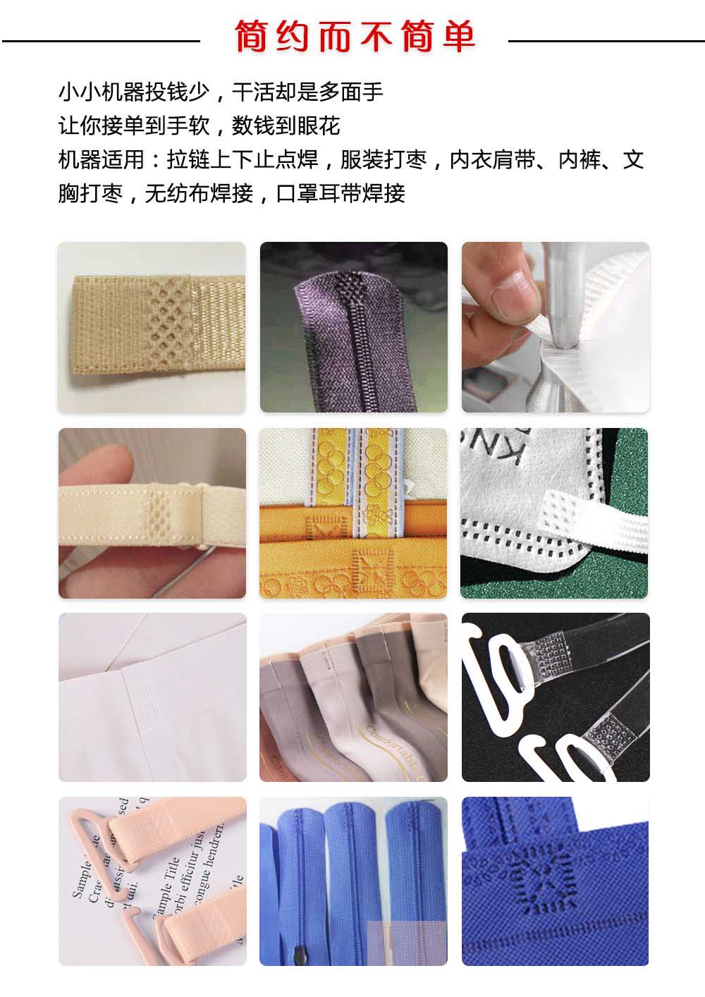 超聲波單頭點焊機具備快速、穩定的焊接速度,在拉鏈定位、打棗以及肩帶、織帶等焊接工藝中都能夠快速完成。相較于傳統的手工操作,超聲波單頭點焊機大大縮短了生產周期,降低了勞動強度,并且節省了大量的時間和精力。