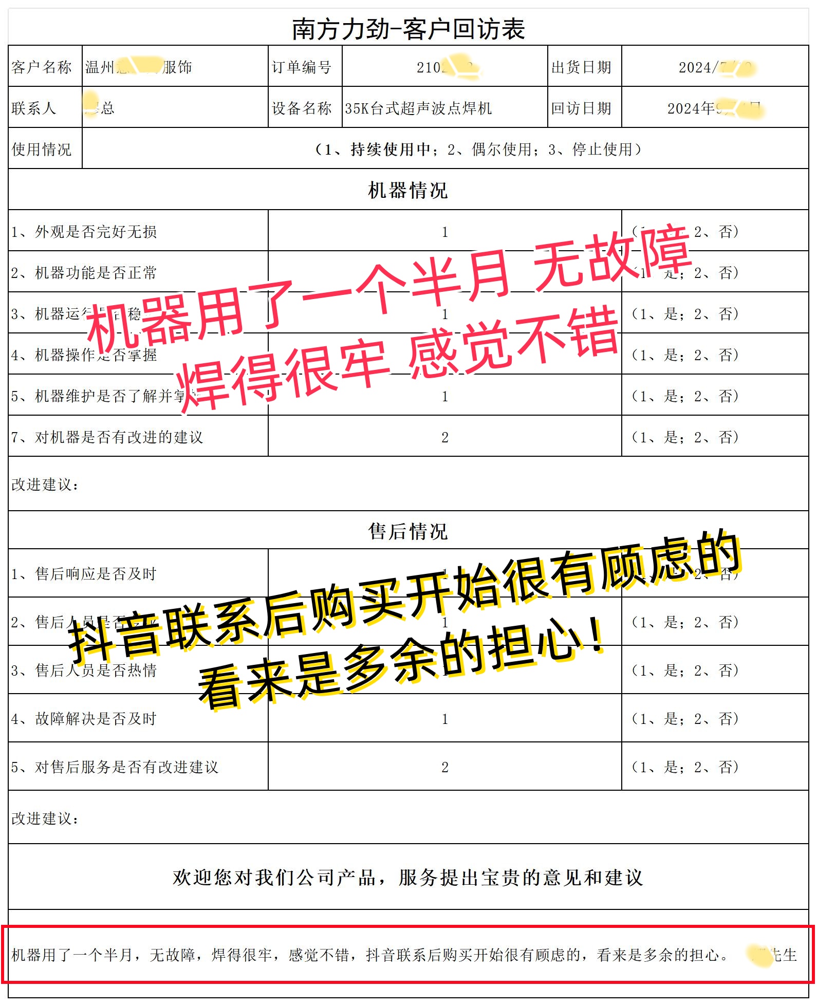 這位客戶在使用超聲波點焊機一個半月后,給予了如此高的贊譽。無故障運行,焊接牢固,這不僅是對設備性能的肯定,更是對我們品牌的信任。 一開始的顧慮,在實際使用中煙消云散,充分證明了我們的超聲波點焊機經得起考驗。